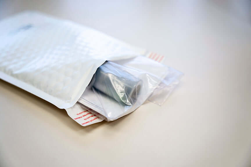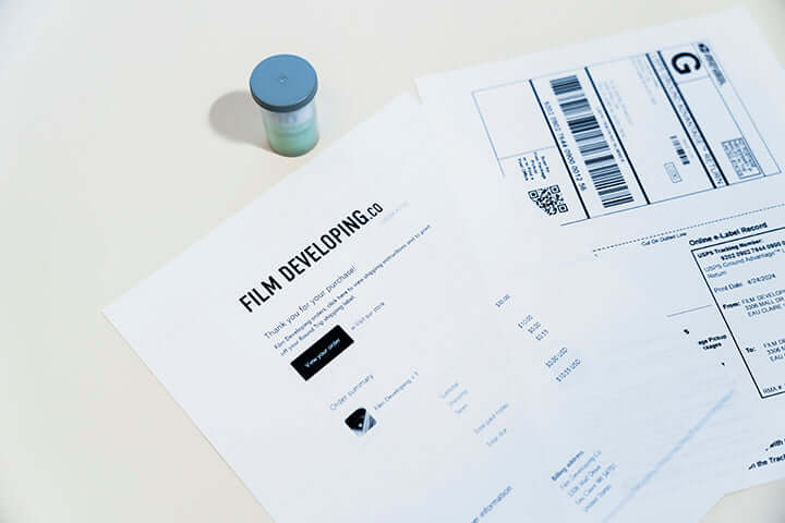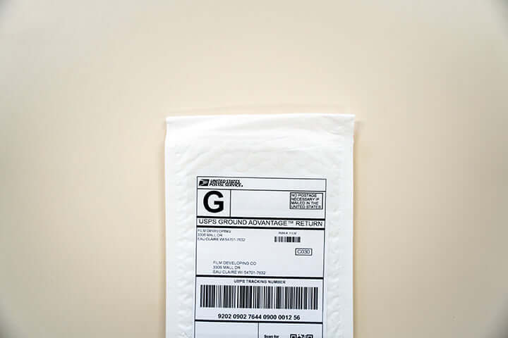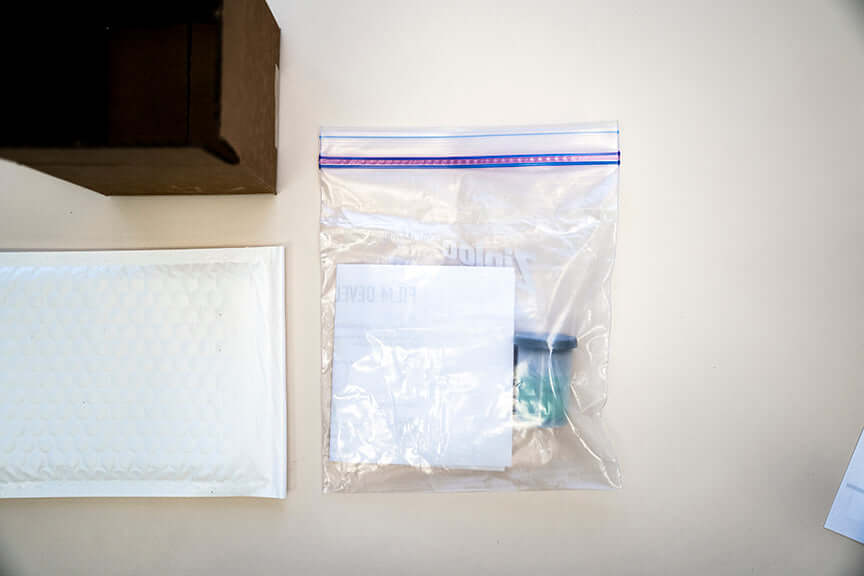 Place the sealed ziplock bag containing your film and order form into a padded envelope or box. Make sure all openings are fully closed and reinforced. Avoid using thin letter envelopes or paper mailers, they often tear open during processing at the post office.
