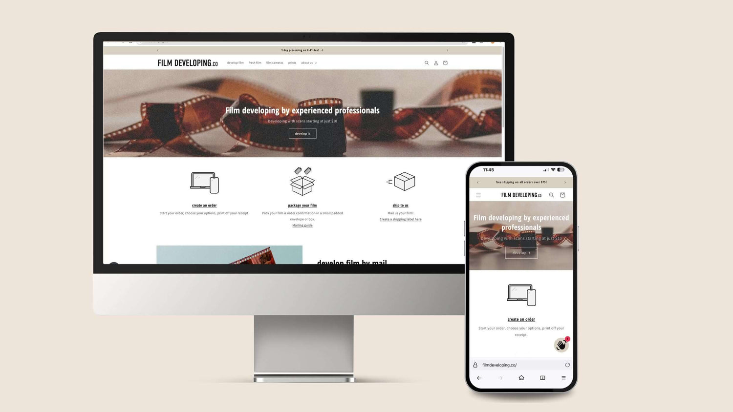 Visit our develop film page to get started with an order. Select your film format, process type (C-41 or black & white), scanning resolution, and if you'd like to add prints. Additionally, specify how you'd like your negatives returned (cut or uncut).